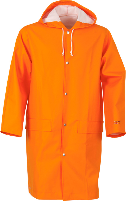 100 cm lång rock med kapuschong och vattentäta fickor framtill. Praktisk med uppvikbar nedkant. Knäppes med tryckknappar. Tillverkad i GARDA-Flex.