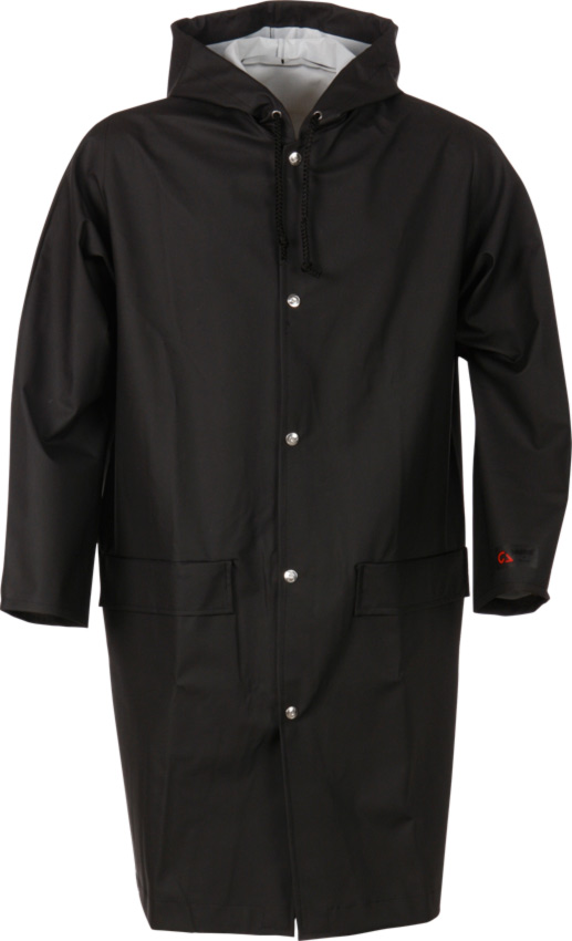 100 cm lång rock med kapuschong och vattentäta fickor framtill. Praktisk med uppvikbar nedkant. Knäppes med tryckknappar. Tillverkad i GARDA-Flex.